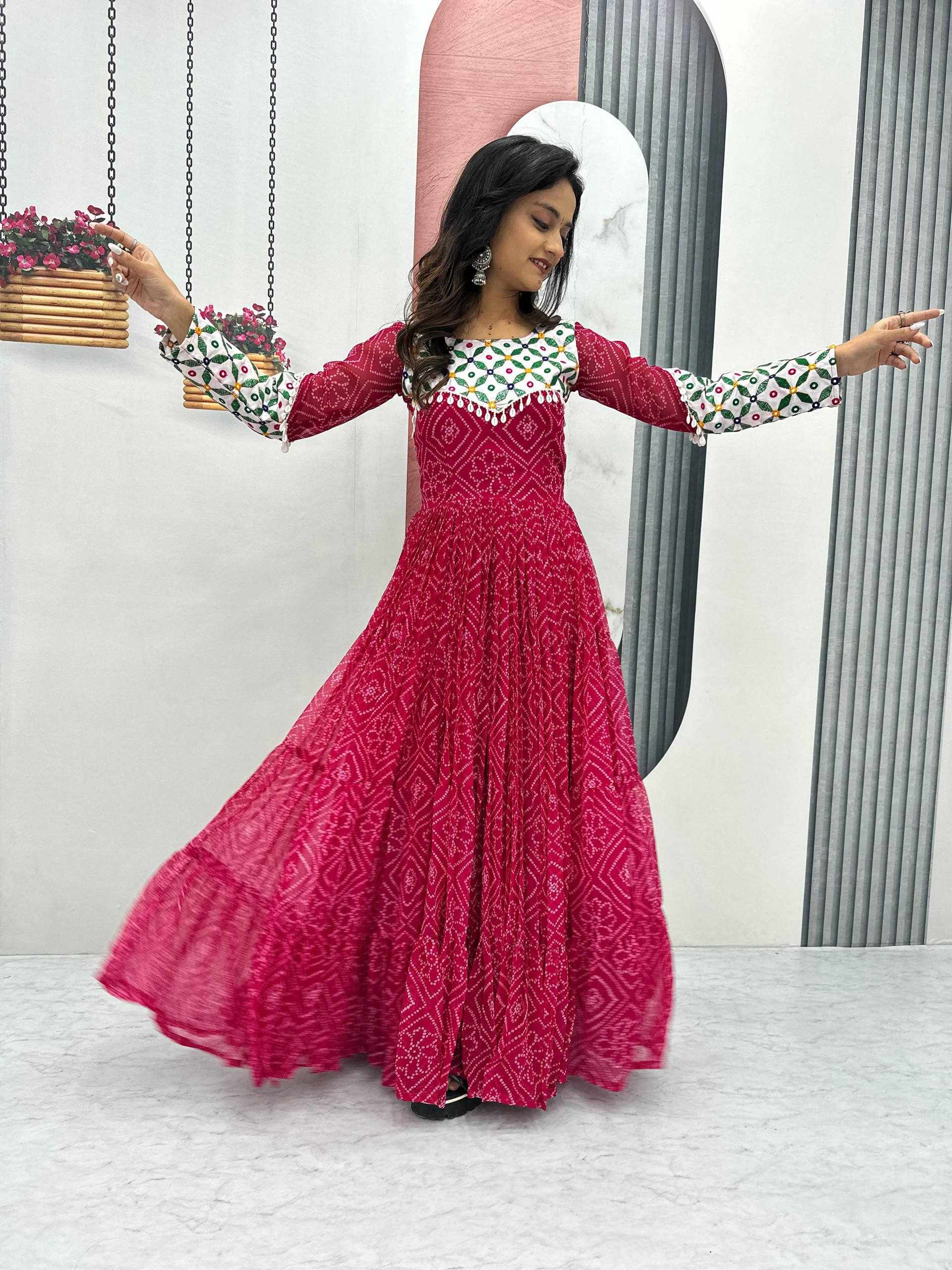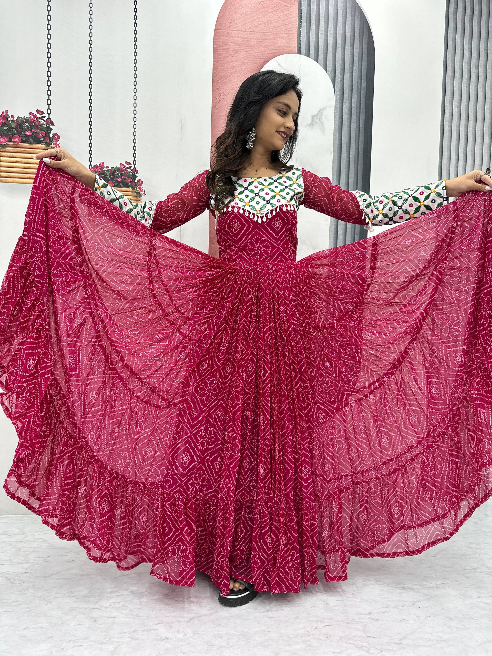 | Name : | Pc N42 Pink Fox Georgette Gamathi Work with Kodi Lace Navratri Special Gown |