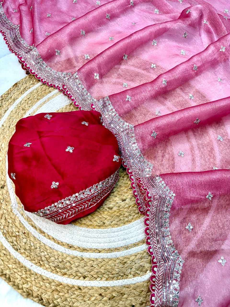 WORK: Thread embroidery lace and also zari and sequins work on all over the saree...